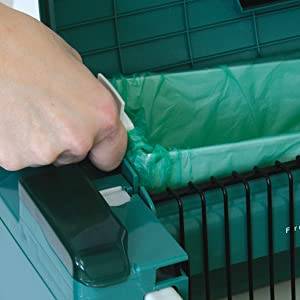 Once your waste collection bin is full, simply remove the tray, take off the waste bag, toss the bag, and replace with new one!