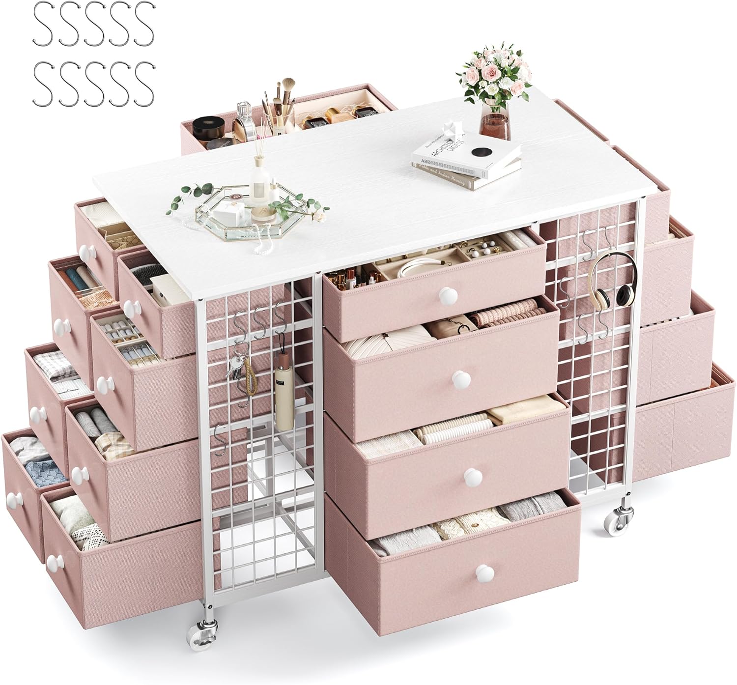 24 Drawers White Dresser for Bedroom, Dressers & Chests of Drawers with 4 Wheels and 40�� * 23�� Wide Wooden Top, Metal Frame, Closet Island with Hooks for Bedroom, Cloakroom, Dressing Room